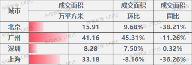 上周一线%,广州升幅较大,约为45.3%;北京居其次,升幅为9.7%。同比来看,楼市整体成交下降,降幅为25.6%。其中,北京降幅较大,约为38.2%;上海居其次,降幅为36.3%。