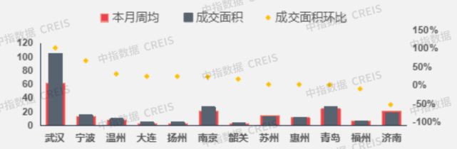 二线%。环比上升的城市中,武汉升幅显著,约101.1%;宁波居次位,升幅为66.3%。三线代表城市成交量环比上升8.2%,扬州升幅较大,约为23.4%。同比来看,三线%。