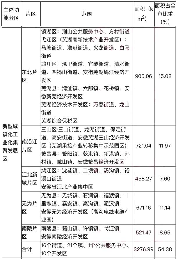 新型城镇化工业化集聚发展区包括核心优化区外围镇(街道)和国家级、省级开发区,以及芜湖县、繁昌县、南陵县、无为县部分城镇化、工业化重点开发区域,共16个街道、21个镇、1个公共服务中心、10个开发区,国土面积3276.99平方千米、占全市国土面积的54.38%。