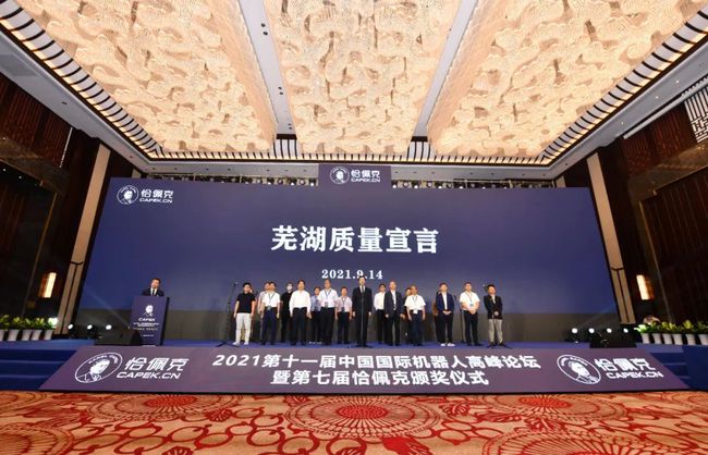 9月14日,在2021第十一届中国国际机器人高峰论坛暨第七届恰佩克颁奖仪式开幕式上,来自全国范围内的20名产业各领域权威代表签署并发布了机器人产业《芜湖质量宣言》。